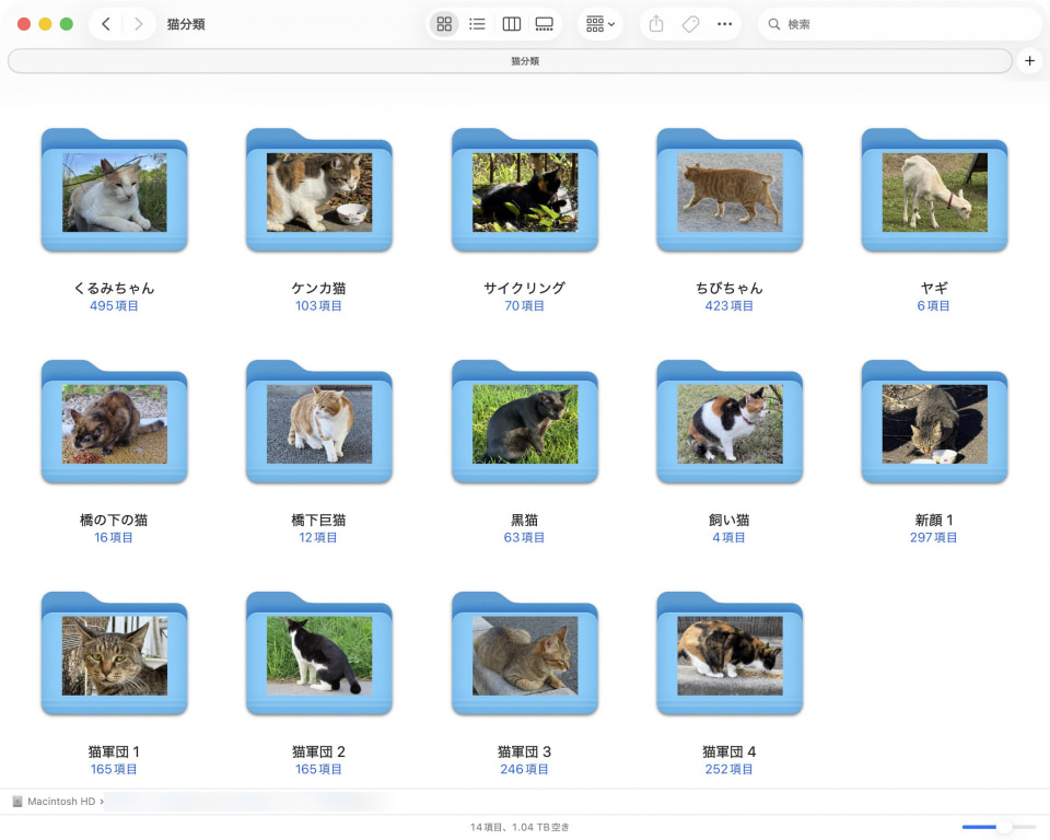 そうしているうちに「フォルダに猫の顔や体の写真が貼ってあったらすぐわかる」「あいまいな俺ルール名前を手がかりにせず、猫写真がフォルダになっていれば一発で思い出せる」と考えた。フォルダのアイコンの上に各種地域猫の写真が貼ってあれば、中身の写真もすぐ思い出せるというわけだ。