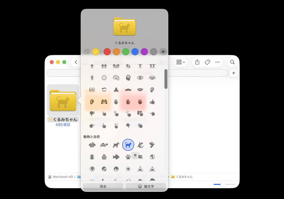 macOS標準の機能で、フォルダをより「グラフィカルに把握しやすく」できる。記号や絵文字は幅広いカテゴリーを網羅しているが、ひとつのカテゴリーにおける種類が少ない。