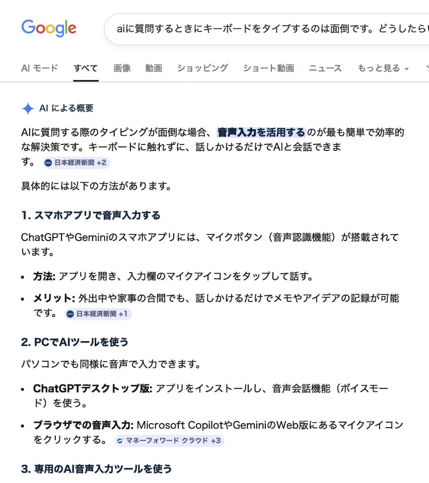 じゃぁ音声入力を使えばいいじゃな〜い♪ と思ったが、一応Geminiさんにも訊いてみた。