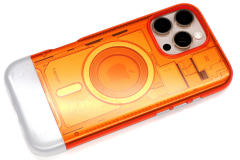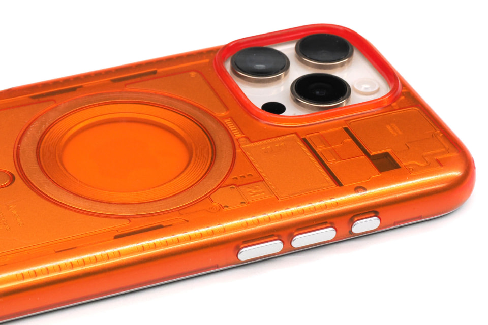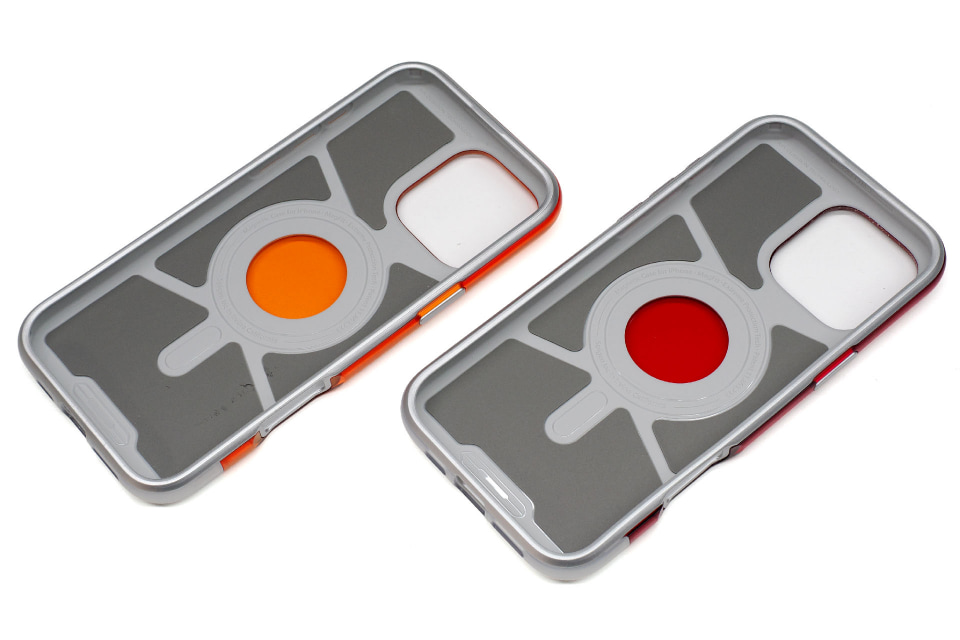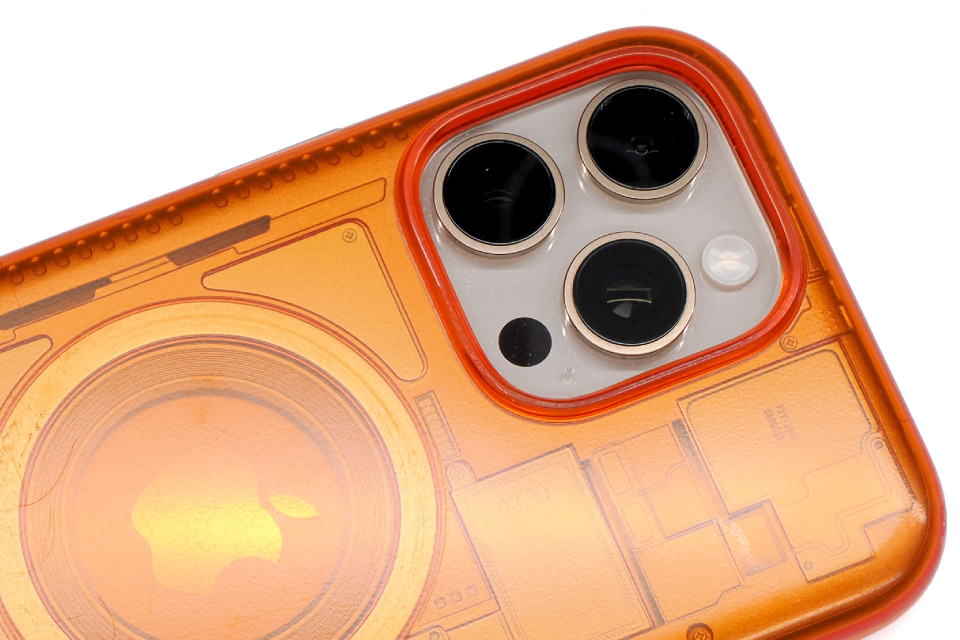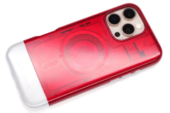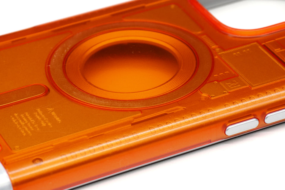 表面がツヤツヤではないので、指紋汚れが目立ちにくいというのもイイ。同様に傷も目立ちにくい。1年間MagSafe充電器へと着脱を繰り返していると、ツヤツヤ系ケースはMagSafe部分にけっこう傷がつく。このケースにも傷はついているが、セミマットの表面と強いカラーにより傷が全然目立たないのだ。