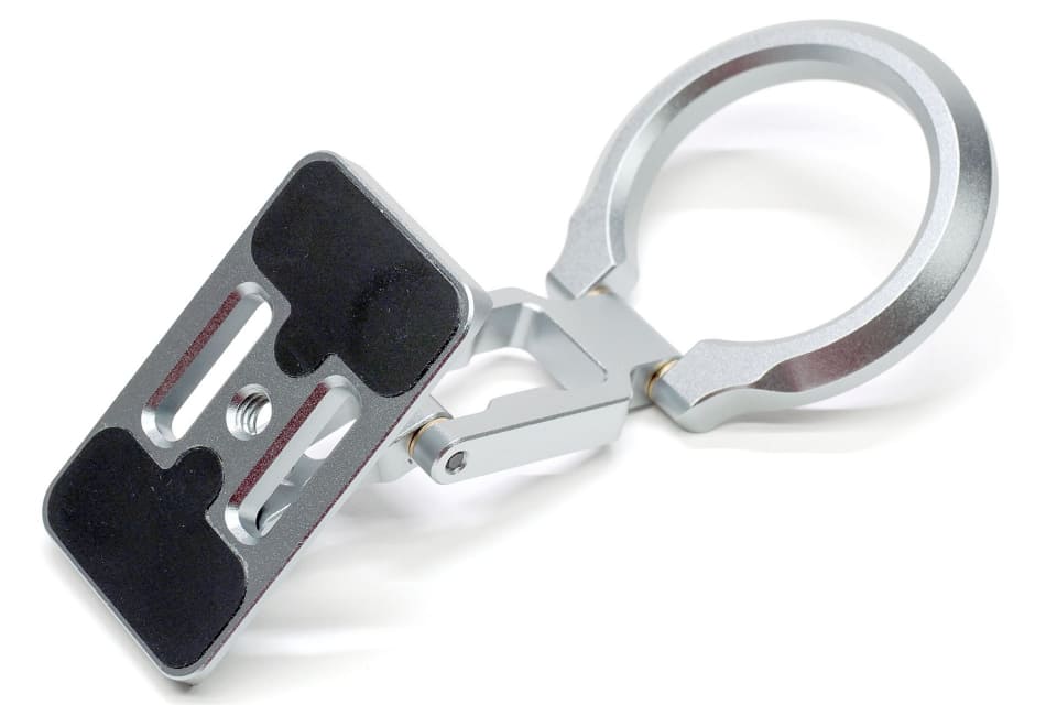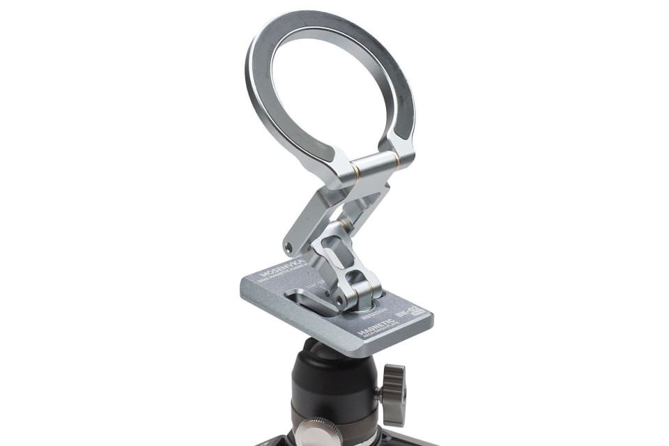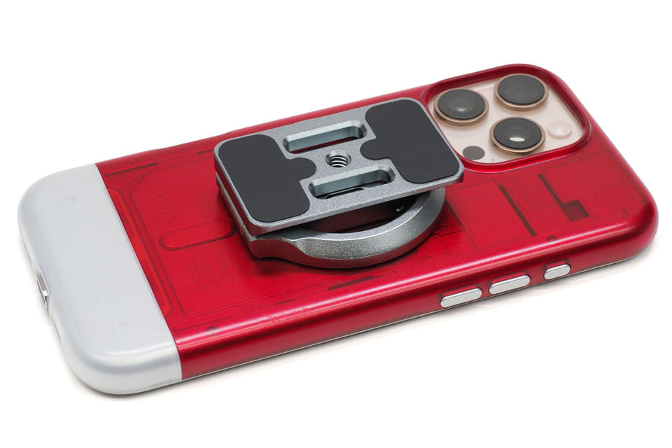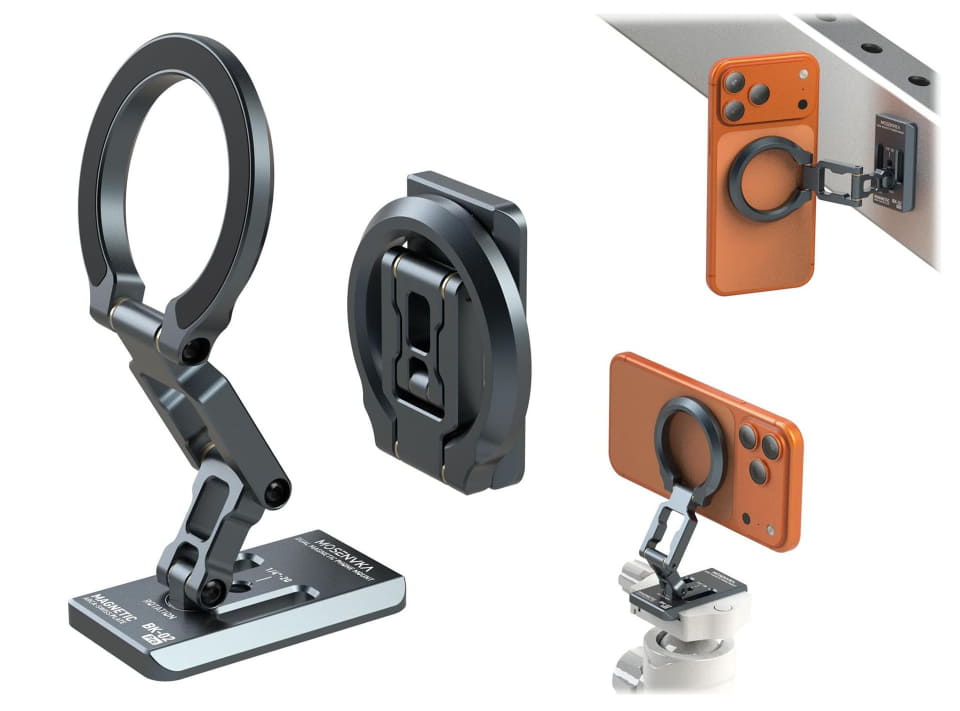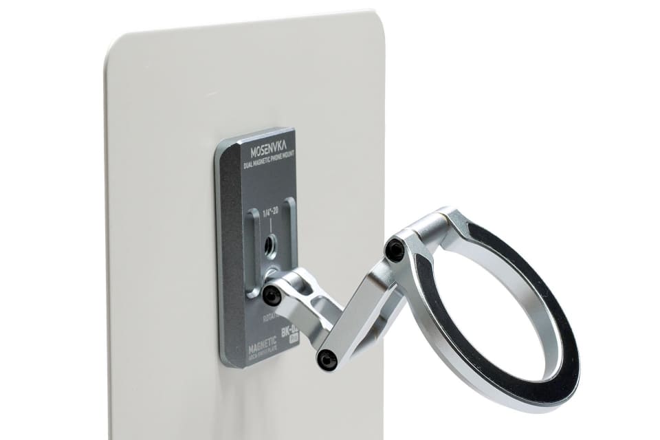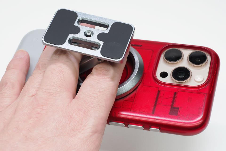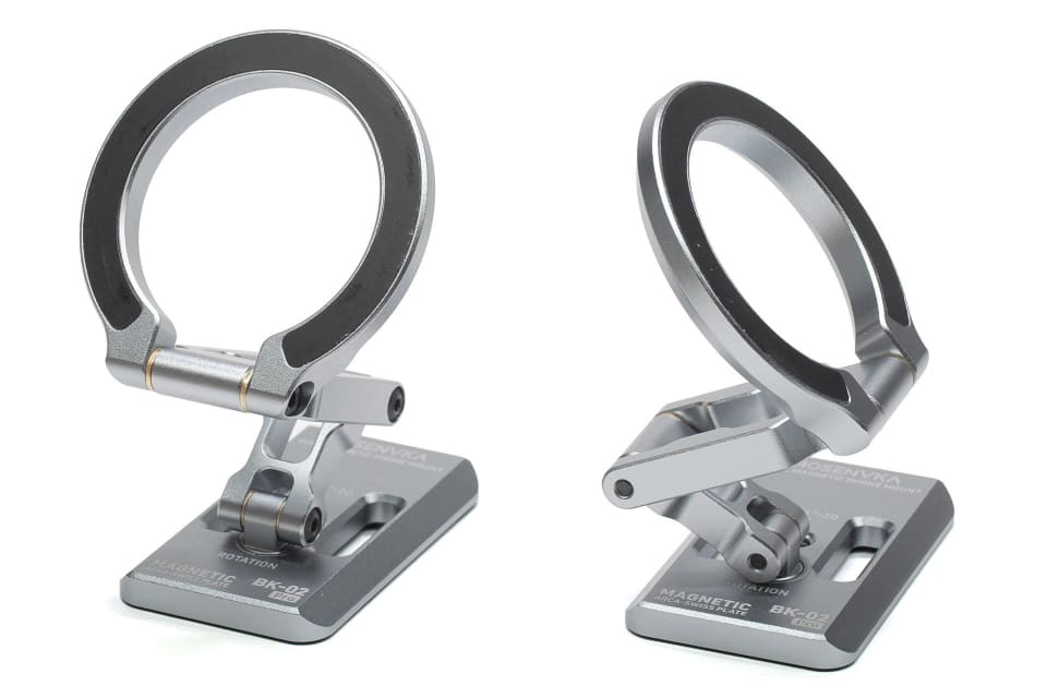 MOSENVKA「BK2-PRO」はMagSafe対応のスマートフォンやスマートフォンケースを吸着保持するスマートフォンホルダー。台座部分がやや広めなので、そのまま置いてスマートフォンスタンドとしても使える。また台座部分はアルカスイス互換プレート形状で、三脚固定用ネジ穴もあるので、アルカスイス互換クランプにセットすることもできるし、三脚(の一般的な雲台)にセットすることも可能だ。