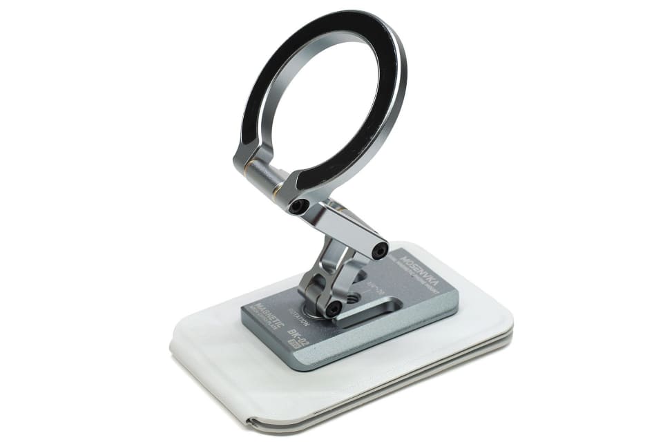 MOSENVKA「BK2-PRO」がさらにグレイトなのは、台座部分に強力なマグネットを内蔵している点。つまりは、スチール面にガッチリとくっつくMagSafe対応スマートフォンホルダーとしても利用できるのだ。