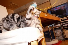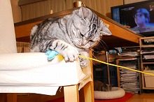 拙宅猫とろ様は、遊ぶときはチョー遊ぶプレイ猫様なのであった。とくに冬は元気。以下、真冬に遊びまくりだったとろ様写真を並べてみたい。