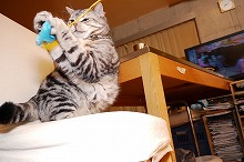 | (1)ニャ!! おもちゃ!! 捕まえてやる噛んでやる殺してやる!! 的な興奮状態である。右下のうか様、ビビって手を出せず | (2)このようにマズル膨らましまくり状態&太い腕&野性的な爪でターゲットを捕まえるのであった。うか様は諦めモードに |