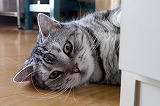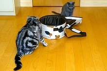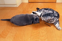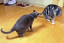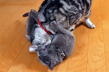 | (1)マタタビ状態のとろ様にうか様が近づくと……あ!! おまえは、うか!! 猫パンチしてやる猫パンチしてやる猫頭押さえもしてやる!! みたいな | (2)間もなくじゃれ合いつつ格闘。両者とも楽しんでいる……のは短時間で、そのうち、うか様が「ニャばい(←ヤバいの意)!!」と思ってか、威嚇&脱出する |