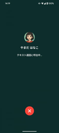次に登録した相手を選んで「タップでテキスト通話」ボタンを押すと、電話をかけるのと同じように相手の呼び出しが始まる。それに相手が応じれば、テキストチャットの開始だ。