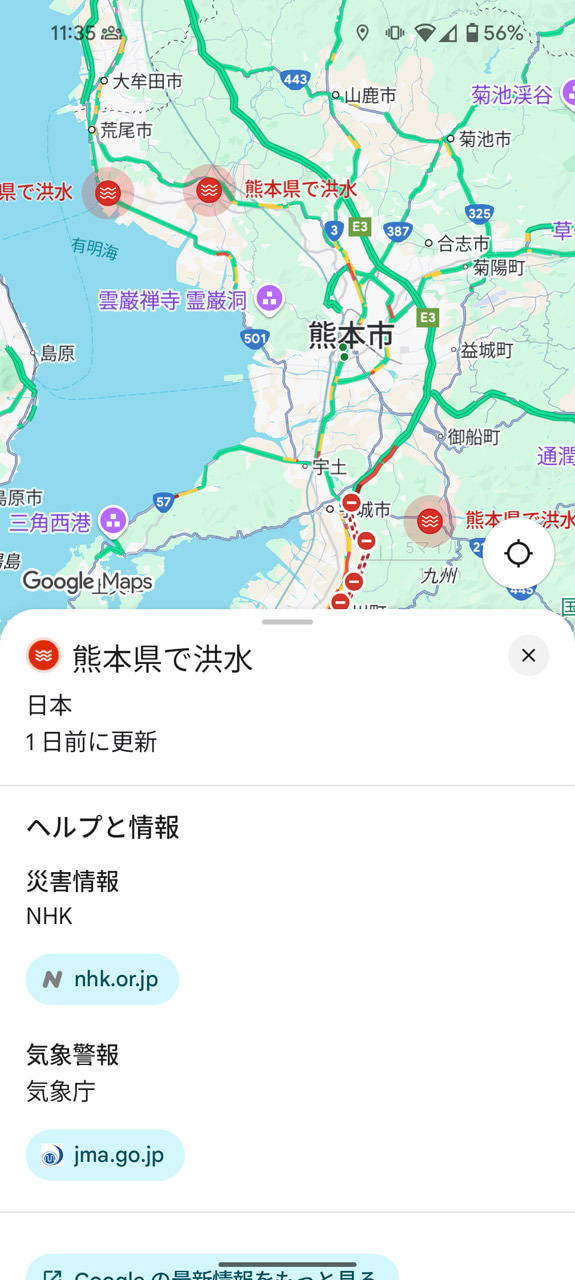 8月の3連休付近では、熊本県を中心に九州地方で大雨による被害が拡大した。今は天気アプリなどで災害情報や防災情報を得られるが、こういった災害時に現地の詳しい状況を知りたいなら、意外と「Google マップ」が役に立つところもあるので、紹介しよう。