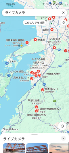 WebやYouTubeだと地名での検索がメインになってしまうので分かりにくい時もあるが、Google マップなら地図を見ながら探せるので、手間取ることなく自分の知りたい場所のライブカメラに行き着けるだろう。