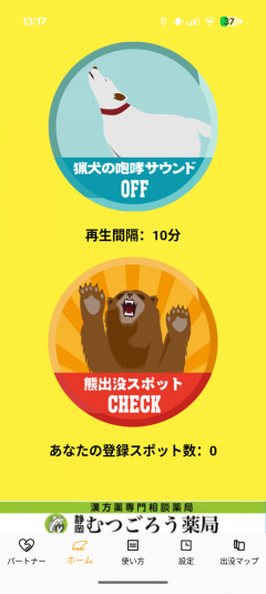 「BowBear」は、熊の出没対策に使えるアプリ。「熊出没スポットCHECK」と「猟犬の咆哮サウンド」という2つの機能があり、それぞれ大きなボタンをタップするだけで使えるシンプルなつくりだ。大まかには、前者がアウトドアに出かける前に使う機能、後者が山登りなどレジャーの最中に使う機能となる。