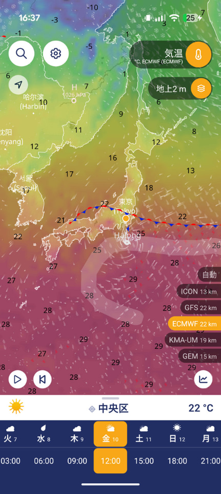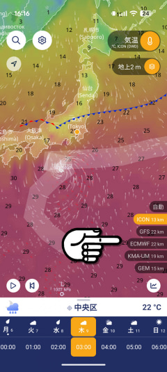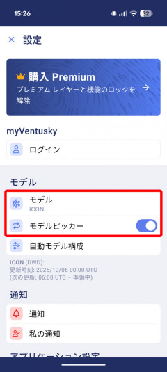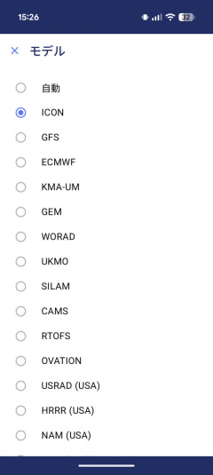 設定画面にある「モデル」で一覧表示されるもののうち、「ICON」「GFS」「ECMWF」「GEM」の4つが台風の進路予測に対応しているものなので、まずは好きなものを選ぼう。同じ設定画面にある「モデルピッカー」を有効にしておけば、それら複数の予測モデルを地図画面で素早く切り替えられるようになる。