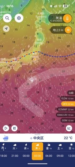 台風の進路予測には、日本の気象庁が使用しているローカルモデル以外に、世界各国が使用しているグローバルモデルも用いられる。本アプリは後者のグローバルモデルを複数から選択でき、それぞれで異なる台風の進路予測を地図に重ねて表示する。しかも無料の範囲内で利用可能だ。