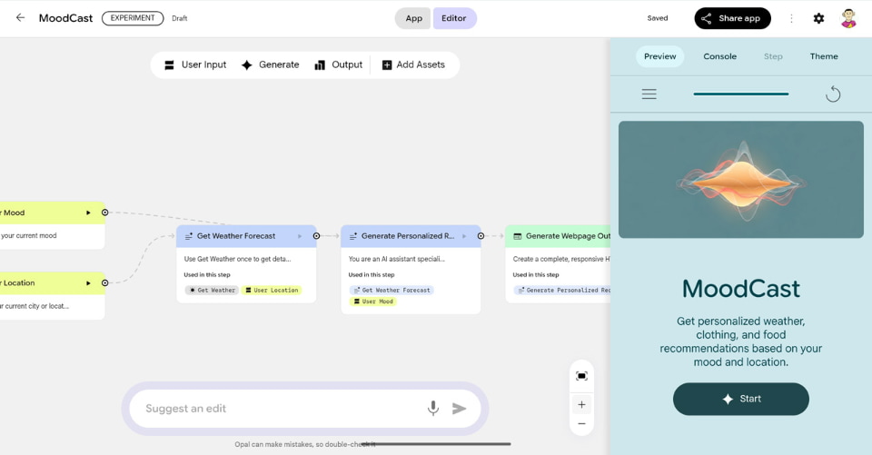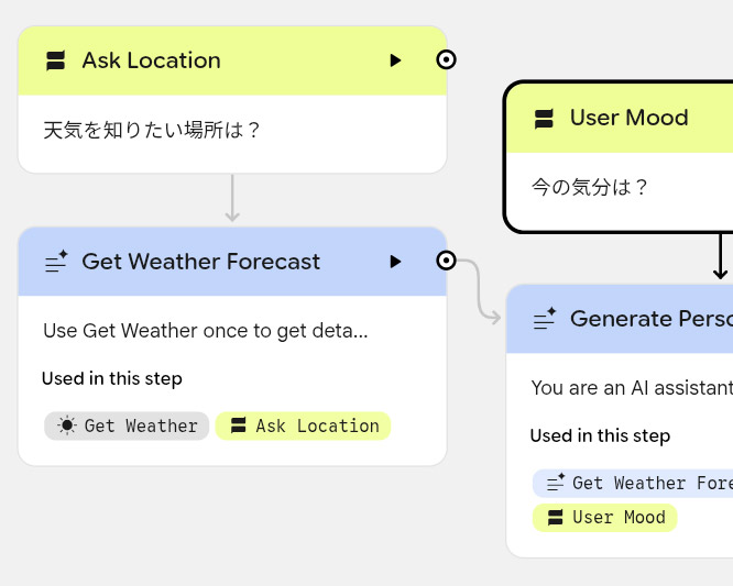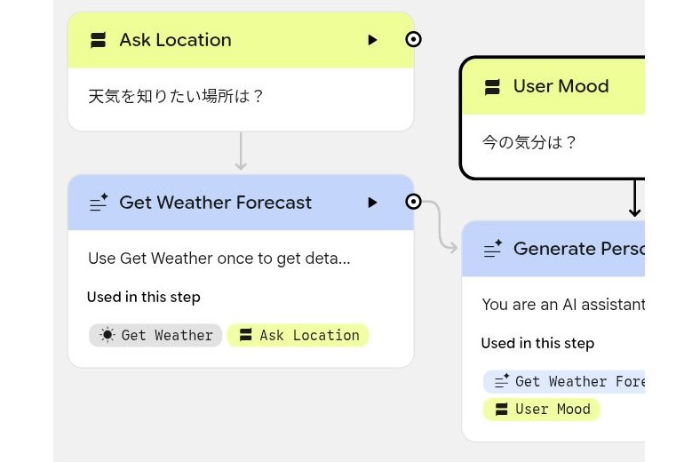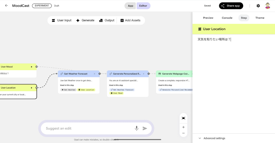 試しにプロンプトで「ユーザーに今の気分と地域を尋ね、その地域をもとに天気予報の情報を取得。出力画面では2時間ごとの天気を列挙しつつ、そのときどきの天候に合わせた服装を提案し、天気とユーザーの気分を考慮した朝食、昼食、夕食を提案する」というように入力して数十秒待つと、その処理に必要なノードが自動で生成された。あとは「Preview」で動作を確認し、「Theme」でアイコンを設定すれば完成だ。