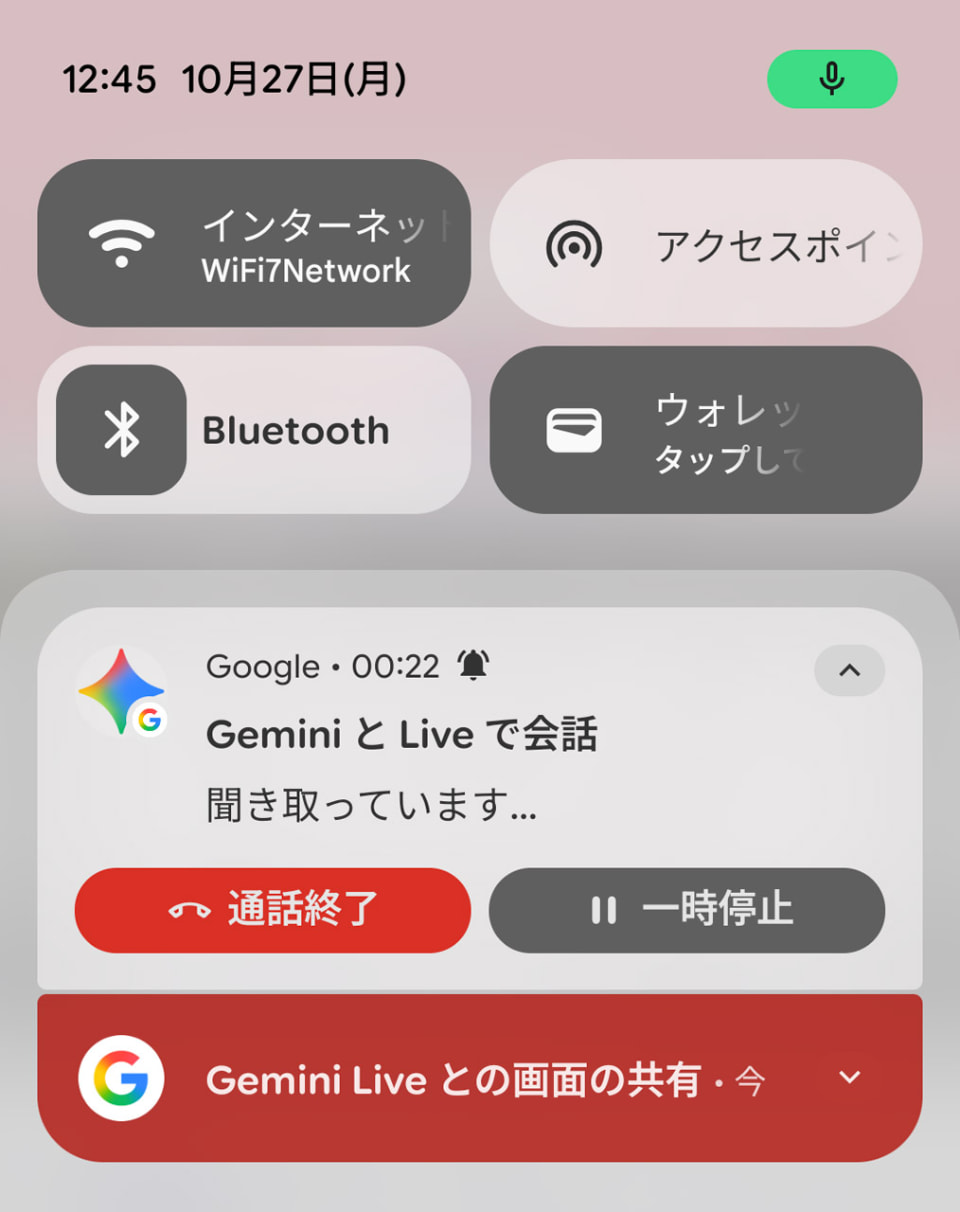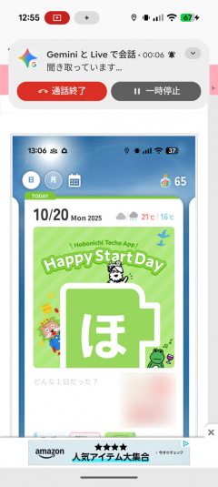 使い方は、AIチャットアプリを起動してライブ会話の機能を立ち上げ、そこから画面共有の機能を選ぶだけ。そうすると他のアプリを使用中でもAIアシスタントがバックグラウンドで常時待機し、画面録画がスタートする。