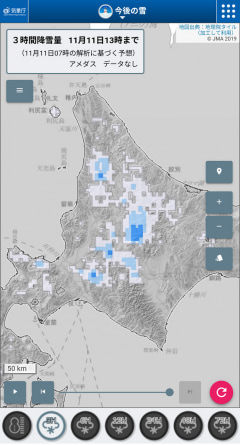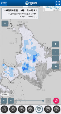 各地における現在の雪の状況に加えて、過去24時間分のデータと今後6時間の予測を1時間単位で確認することもできる。再生ボタンのタップでその推移を連続的に見ていくことも可能だ。1日(24時間)、2日間(48時間)、3日間(72時間)といった一定時間内における降雪量(予測)を確認する機能もあり、天候の急速な変化を察知するのにも役に立つ。