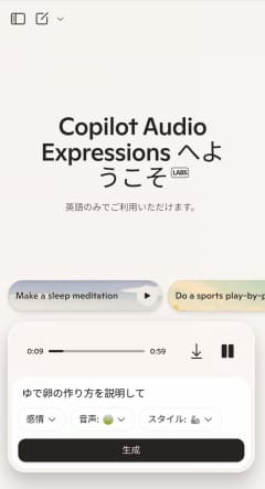 もう一方のCopilot 音声表現は、さまざまな感情や声質、キャラクターなどを選択したうえで言葉をしゃべらせることができるツール。たとえば「Excitement」の感情を選択してプロンプトに話してほしいテーマなどを記述すると、そのテーマに沿ったセリフ内容を興奮した様子で話してくれる。その場で音声再生できるほか、MP3ファイルでダウンロードすることも可能だ。