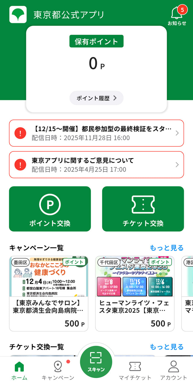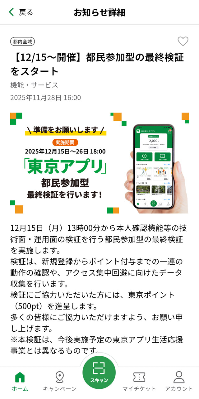 2025年12月5日現在、ポイント付与の時期は決定しておらず、東京アプリ上での本人確認の機能も未実装。