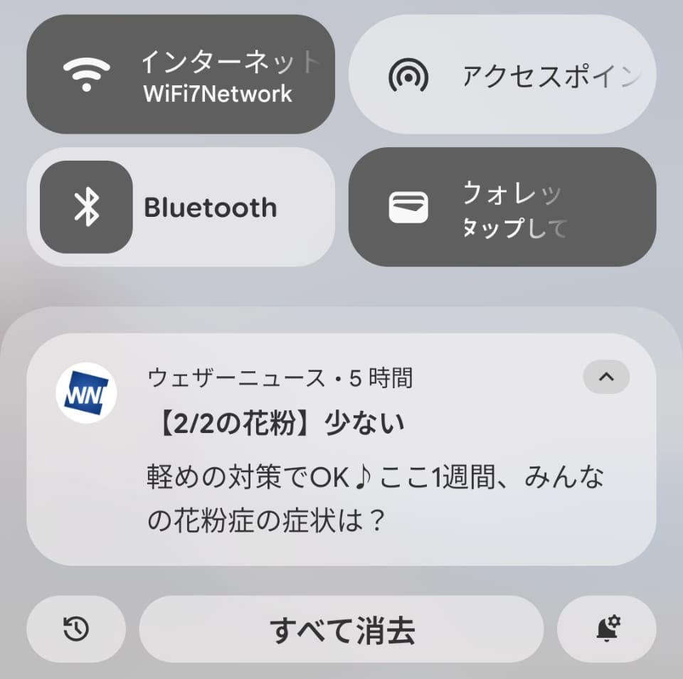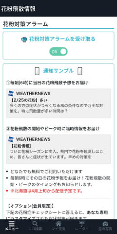さまざまな情報が掲載されているが、そのなかでも初めに確認しておきたいのが「花粉対策アラーム」の設定だ。これを有効にすると、毎朝6時ごろに当日の花粉飛散量の予測や一言アドバイスがプッシュ通知され、1日の始まりとともに対策の必要性をすぐに判断できる。