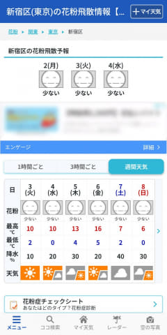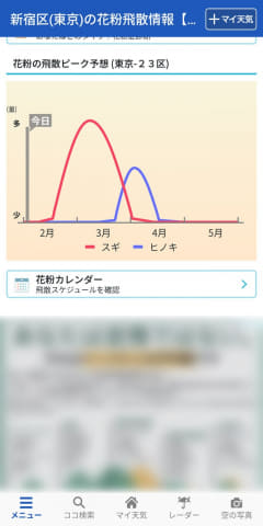 花粉に関わる情報をチェックするなら、おすすめは「ウェザーニュース」アプリ。メニュー画面の中段あたりに「花粉飛散情報」コーナーへのリンクがあり、ここから花粉に関わる詳細な情報ページにアクセスできる。