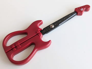 エレキギター型ハサミはそんな中でも一般販売にこぎつけた数少ないアイテムだ。ヘッドストックを引き抜き片側の刃面(指板:フィンガーボードにあたる)にだけ記されたフレットと6本の弦、ポジションマークの繊細さの造りが素晴らしい。本物のエレキギターには無いが10フレットと11フレットのちょうど真ん中にシルバーのネジ(要)がありこれが全体を引き締まって見せている。