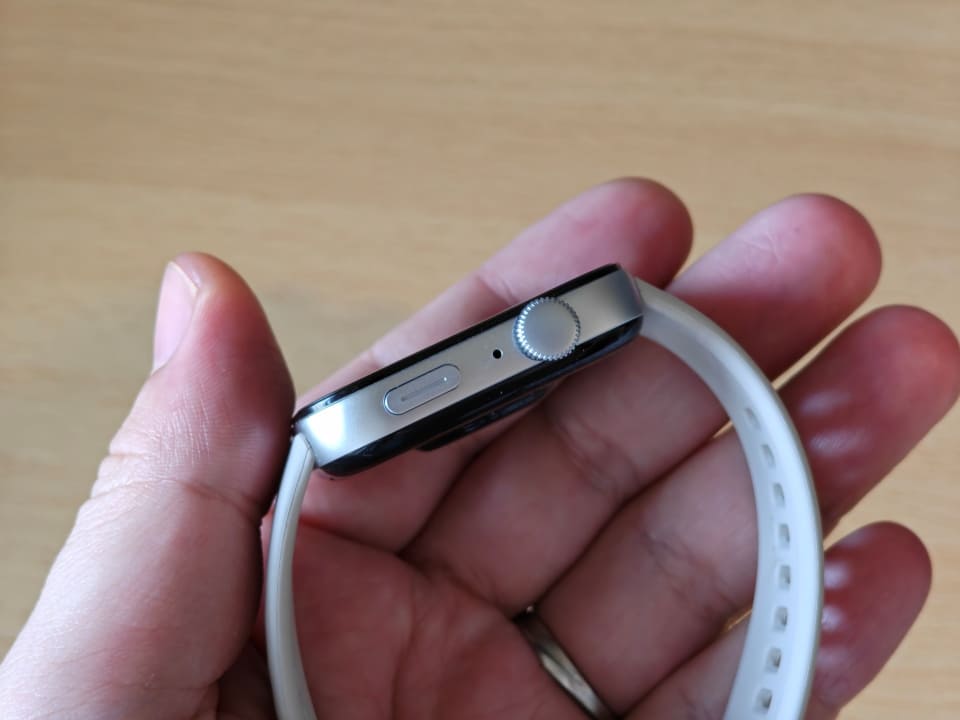 ディスプレイは1.82インチの大画面で、情報を視認しやすいスクエア型となります。側面に搭載されているリュウズで、アプリの切り替えといったスクロール操作が行えるのが、非常に便利なポイント。リュウズの下に搭載されているボタンには、任意のショートカットを割り当てられるので、筆者は頻繁に使うタイマー機能を設定して使っています。