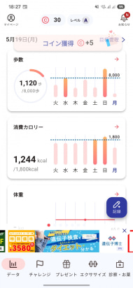 auウェルネスでは、身体データの管理やエクササイズ動画の視聴ができるほか、自分で運動目標を設定し、達成することで、コインを獲得する機能が利用できます。au Smart Watchで収集したデータは、このチャレンジ機能と連携できるのに加え、通常もらえる5コイン/日にプラスして、毎日5コインが獲得できます。