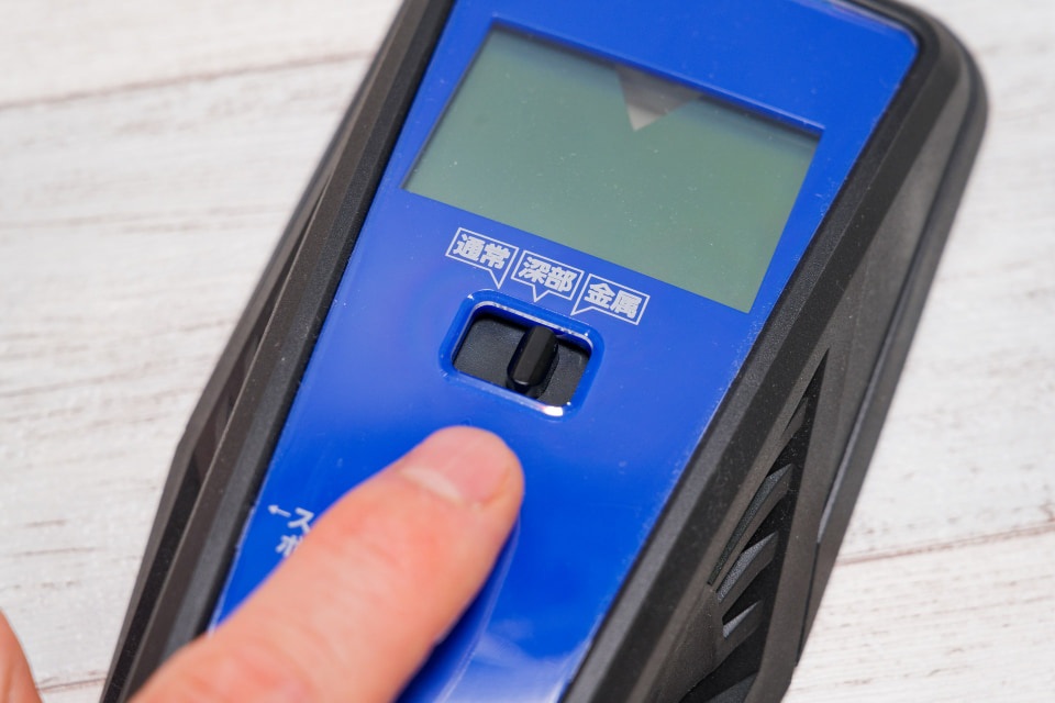 ちょっとだけ高いこともあって、機能は豊富だ。一般的な厚み(19mmまで)の壁の向こう側にある下地を検知する「通常モード」と、より分厚い壁の下地を検知する「深部モード」、さらに電線や鋼管などの金属がある場合に教えてくれる「金属モード」の3種類を切り替えて使用できる。下地センサーの筐体は実測で縦205mm、幅93mmとまあまあ大きいが、この大きさならではの「間柱の中心位置を検出する」という親切な機能もある。