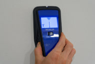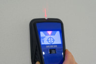 まずは下地センサーの筐体を壁にピタッと当てて、側面にあるスタートボタンを押したまま左右方向にゆっくりスライドさせていく。たとえば石こうボードの向こう側に間柱が見つかるとディスプレイに黒いゲージが現れ、さらにスライドさせていって間柱の中央付近に来ると、赤いラインを投影するとともにブザーが鳴る。この赤いラインの場所が間柱の中心付近、というわけ。