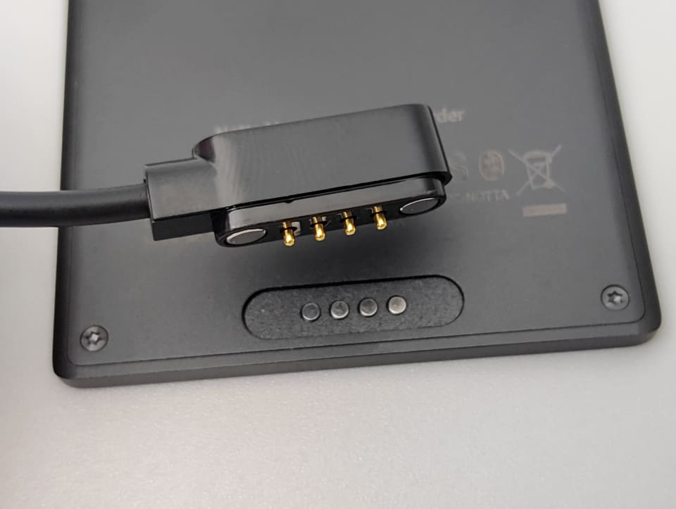 本体への充電は専用充電ケーブルを使って行う。一般的なUSB Type-C端子ではなく、マグネット式ピンを採用しているが、これがなかなか楽である。