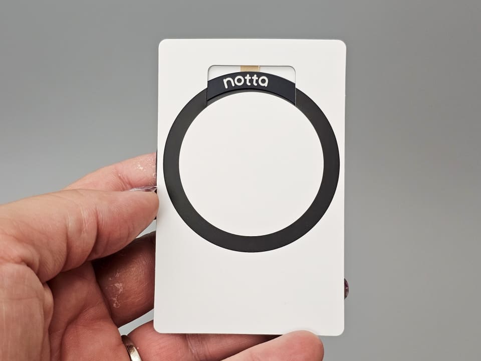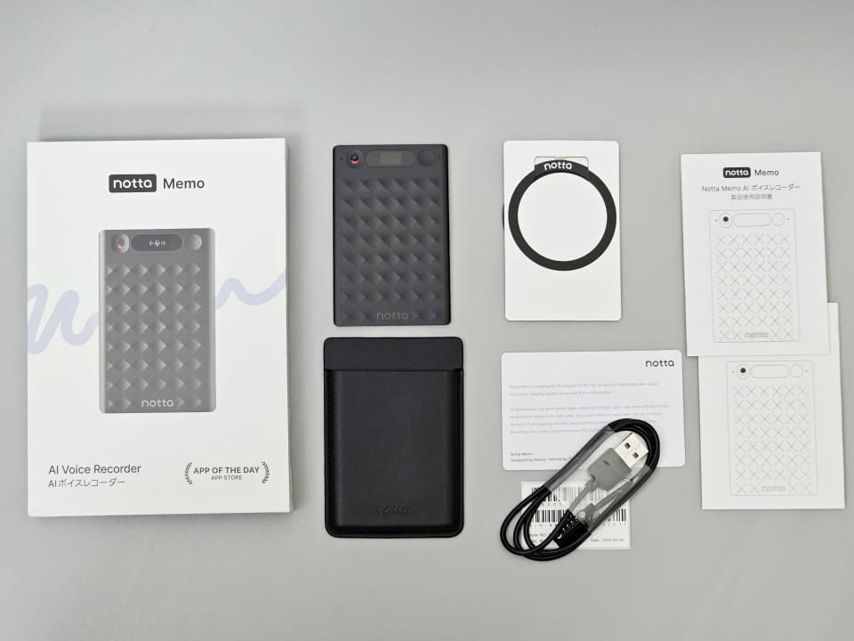 しかし、マグネット式充電ケーブルなら、コネクタを本体のポゴピンに近づけるだけで吸着し、充電をスタートさせられる。暗がりでも扱えるのでかなり便利である。Notta Memoのパッケージには、本体のほか、前述の専用充電ケーブル、MagSafeレザーケース、MagSafe金属リング、そして紙類が付属する。Notta MemoをMagSafeレザーケースに入れておけば、本体が傷つくのを防げるだけでなく、iPhoneの背面に取り付けて常に持ち歩けるようになる。