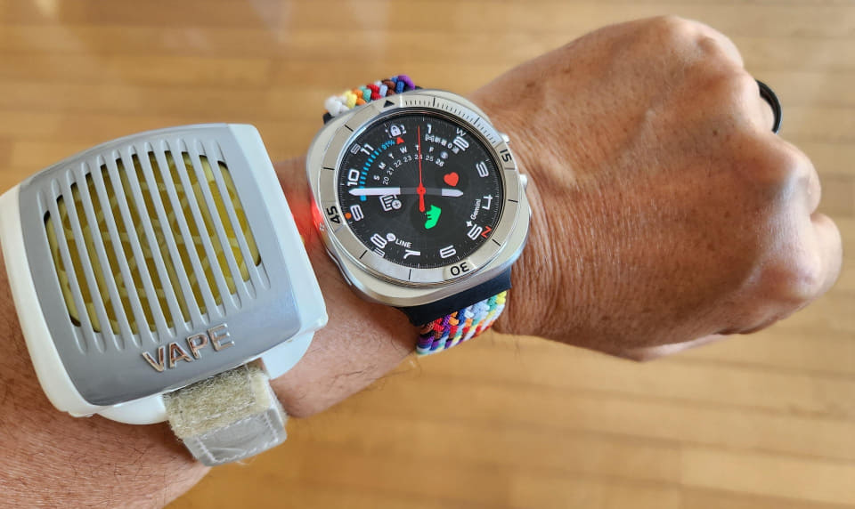 今回は真夏の風物詩・隅田川花火大会でのフィールドテストを敢行。例年、100万人近い人が集まるこの環境は蚊にとって絶好の狩場。だが筆者の左腕にはGalaxy Watch Ultraとともに、この「どこでもベープNo.1未来セット」が装着されていた。