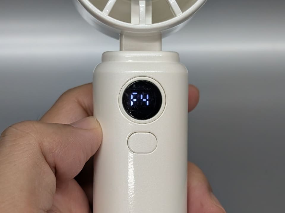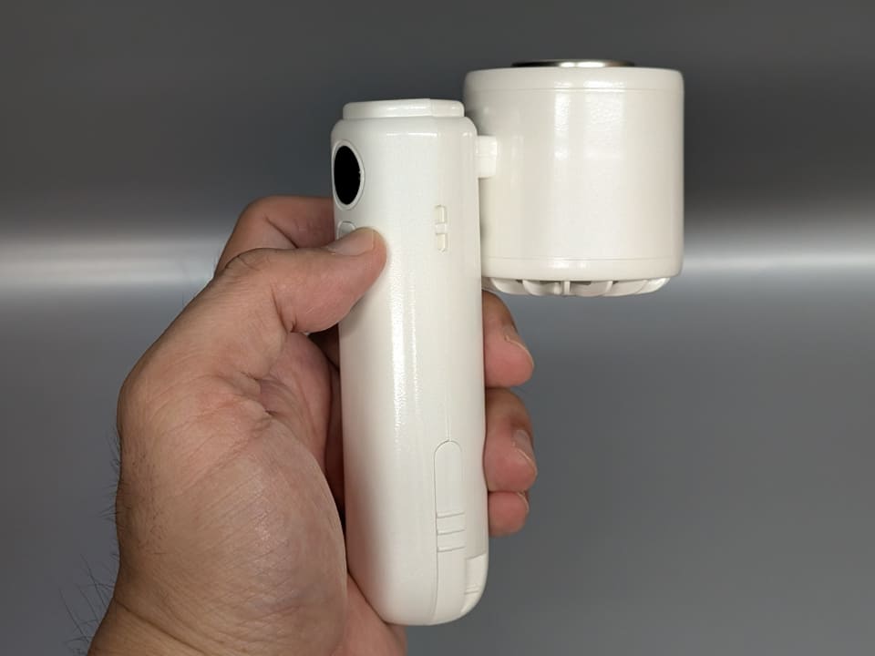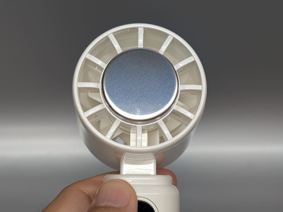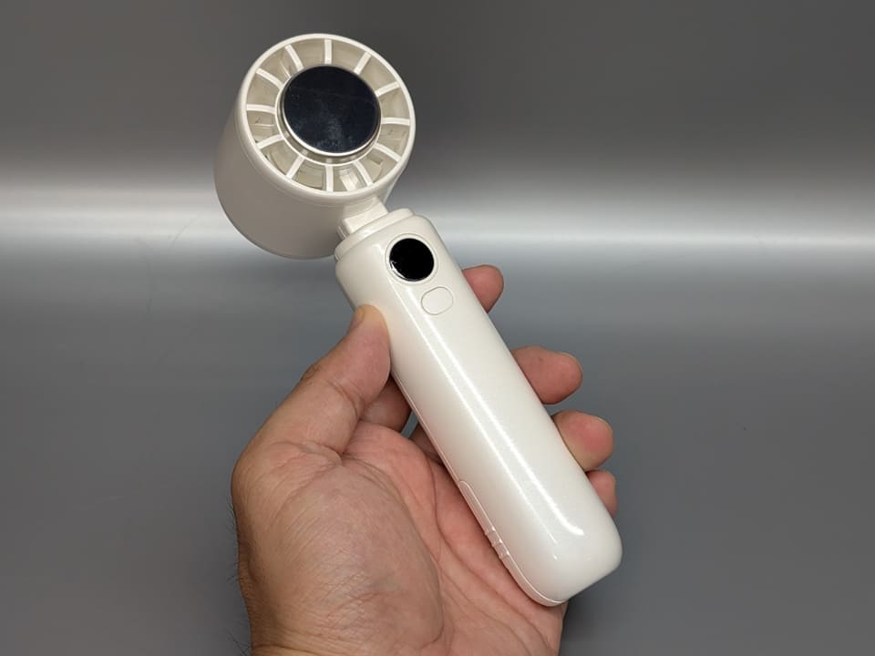 外観は一般的なハンディファンと同じく、スティック状のボディの上部にファンが取り付けられた構造で、スイッチを繰り返し押すと風量が4段階で切り替わる。