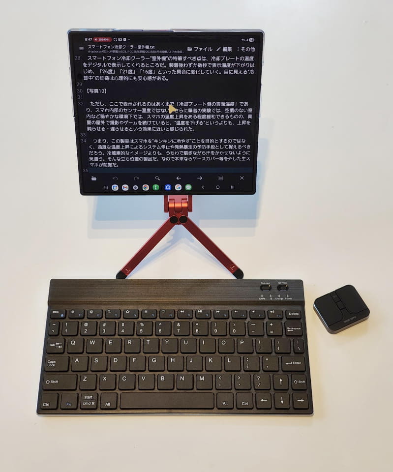 折り畳み時のカバーディスプレイでは通常のスマホとして利用し、必要に応じて開いて8インチの“ほぼタブレット”画面を使う。さらにBluetooth接続でThinkPad TrackPoint Keyboard IIを連携させれば、完全に“ポケットPC”として運用可能だ。