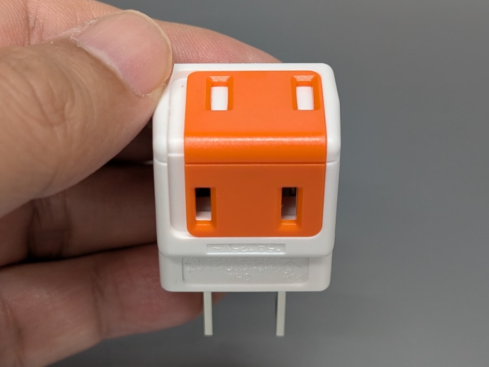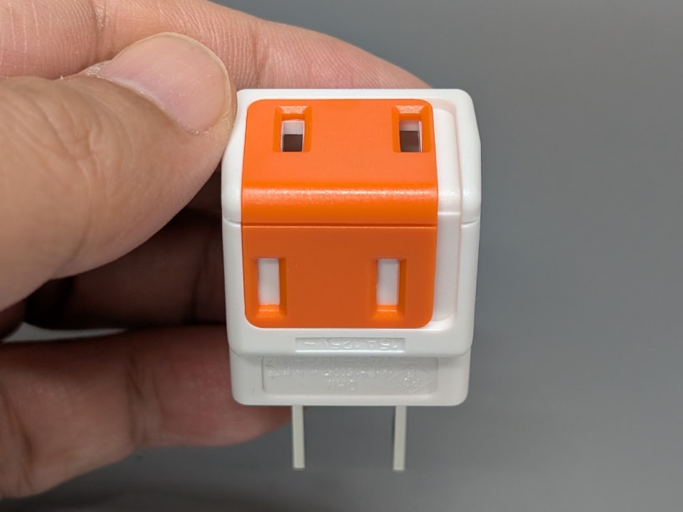 詳細は写真をご覧いただければと思うが、プラグを水平に差し込むと垂直側の口は覆われて差し込めなくなり、また逆にプラグを垂直に差し込むと水平側の口は差し込めなくなるといった具合に、カバーがスライドしてブロックする構造になっている。