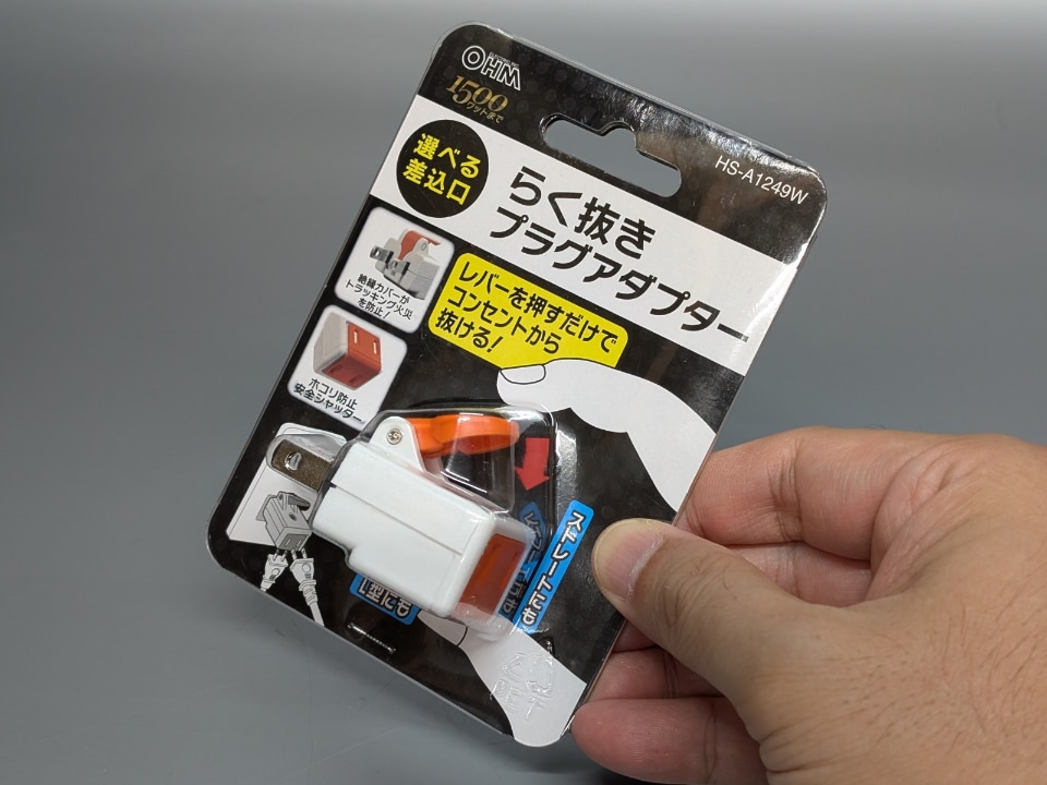 ワンプッシュするだけで、電源プラグをコンセントから簡単に抜けるアダプターは、前回紹介した「らく抜きマイクロタップ」などさまざまな種類があるが、プラグを水平だけでなく垂直にも差し込めるようにするのが、今回紹介する「らく抜きプラグアダプター」だ。