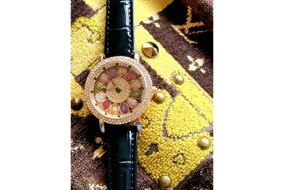 以前の本コラムで「1200円の“なんちゃってセレブ腕時計”」を取り上げたが、今回の個体はそれに負けないインパクトを備える。購入時価格は921円(原稿確認時は760円に値下げ)。名称は便宜上、筆者が造語した「ロータス・ジュエルズ」と呼ぶ。文字盤に12個の大粒の涙型ストーンが花弁のように並び、まるで蓮が開くかのごとく華やぐからだ。商品自体はAliExpressの長文キーワード名モデル(参考:AliExpress商品ページ)で、固有名はない。