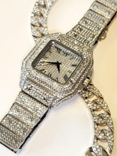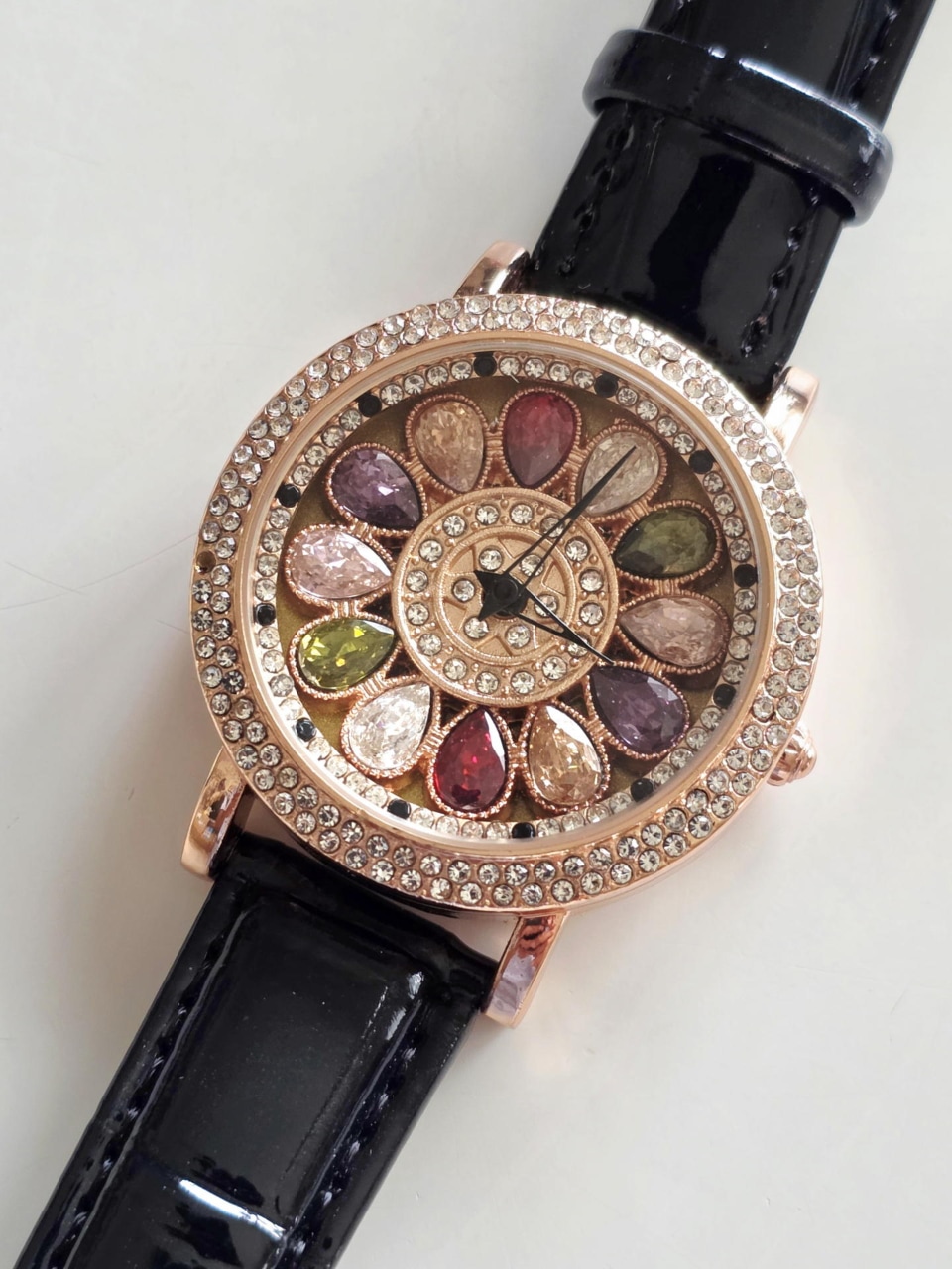 外周ベゼルもセンターディスクも細かなラインストーンでびっしり。ローズゴールド調ケースに黒エナメルのベルトがよく映え、派手とシックの境目を踏み越えるギリギリのバランスを作る。同型で白エナメル版も見かけるが、やや高価でも雰囲気は捨てがたい。どちらも“衣装”として割り切れば選び甲斐がある。