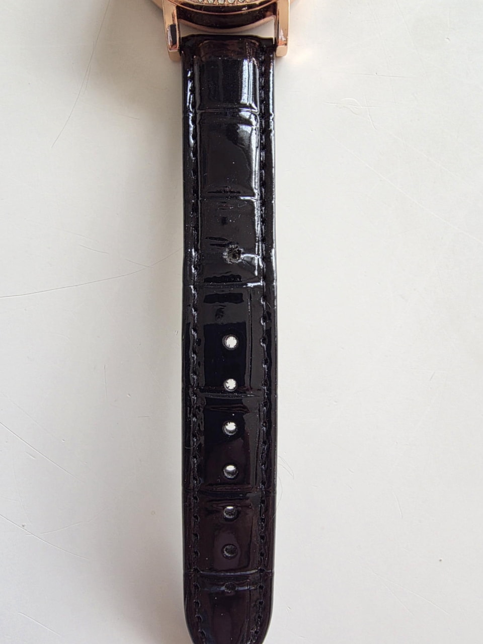 黒エナメルベルトの穴は7つだが、想定腕周りはおおむね17~21cmと感じる。日本人女性の平均14~16cmには緩いことが多いだろう。筆者の環境でも、ケース寄りに追加穴を1cm以上あけてフィットさせている。幸いエナメルは打ち抜きが容易で、細腕対応は難しくない。見た目に反して日常の取り回しは軽く、夏場のブレスレット的使い方にも向く。