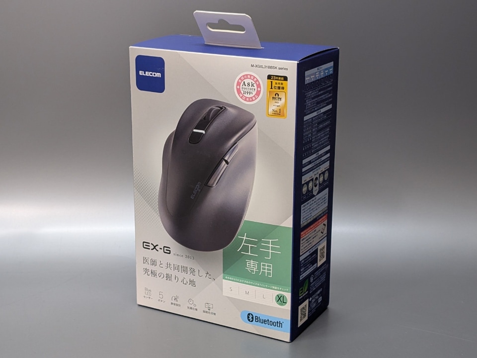 以上の条件に合致した製品として今回入手したのが、エレコムの「M-XGXL31BBSKBK」だ。左手用だけで4つのサイズ違いを取り揃える製品で、接続方法もBluetooth以外に独自2.4GHz、有線を用意するなど、これでもかというラインアップの広さだ。