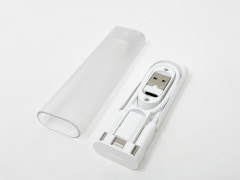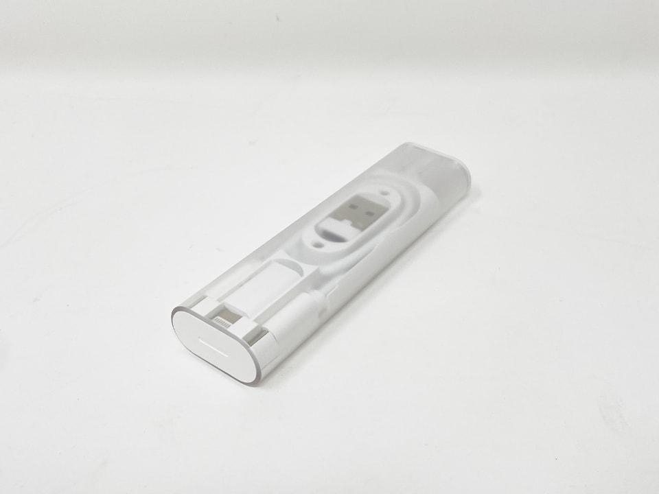 本製品は、プラスチックの半透明な筒の中に、約25cmのUSB Type-Cケーブルと、各端子に接続するための「Lightning端子」、「USB Type-A端子」、「Micro USB端子」のアダプタが収納されています。