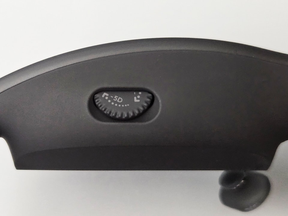 VITURE Proは、1920×1080ピクセル解像度でリフレッシュレート最大120Hzのソニー製OLEDパネルを採用したXRグラスだ。度数調整ダイヤルを搭載しており、0.0度から-5.0度までの視度調整を行える。コンタクトレンズをつける前あるいは外した後の、寝起きや就寝前といったシーンで便利に使えそうである。