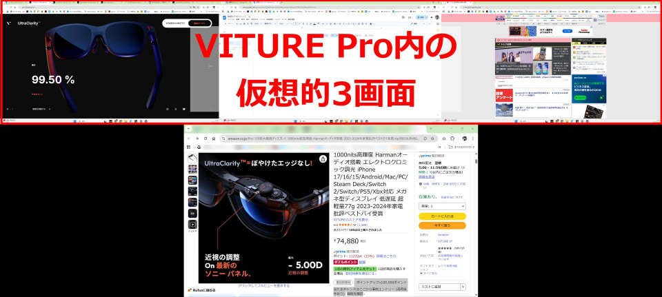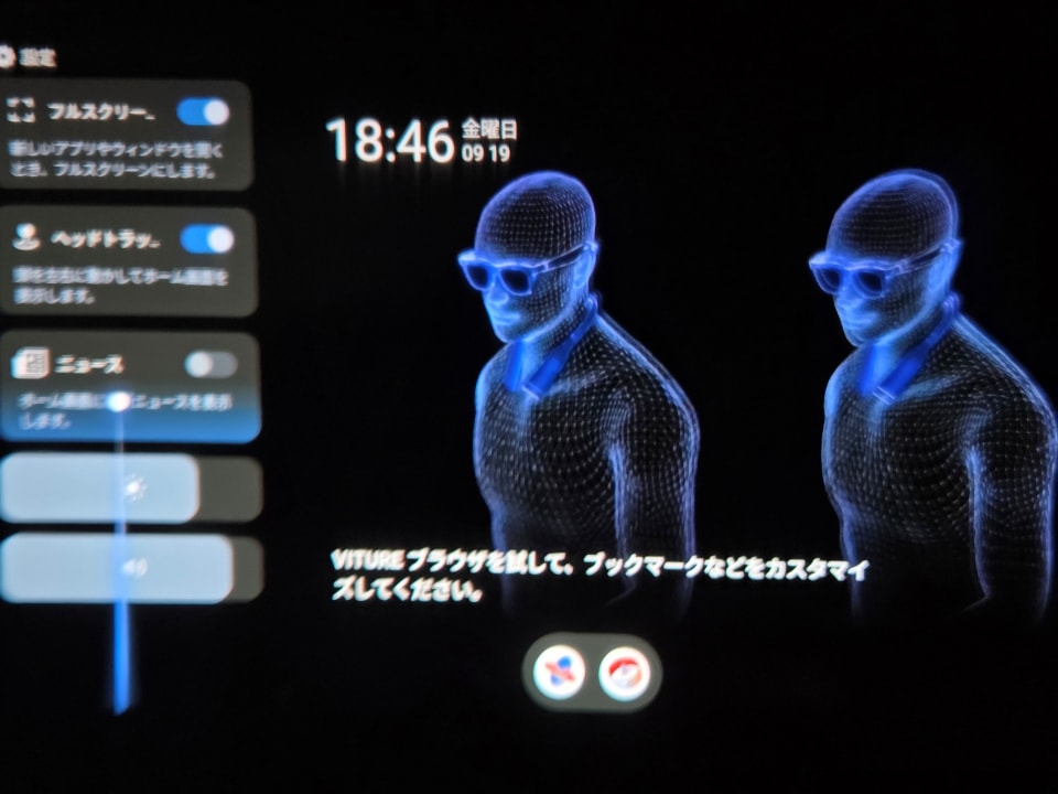 VITURE Pro XR内には3つのスクリーンを同時に表示させられるのだが、最も左のスクリーンにはホーム画面が常に表示されているので、実質2画面ではないのかと思う。ホーム画面を非表示にして3つともブラウザを表示させる方法があるのであれば、ぜひ教示いただきたい。