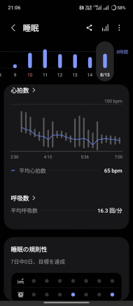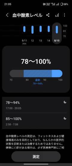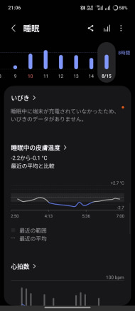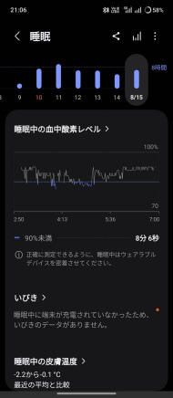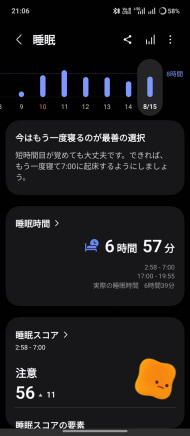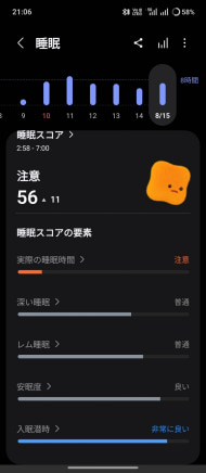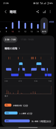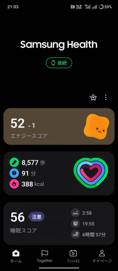 健康管理機能としては、心拍数や血中酸素濃度、ストレス値、夜間のAGEsなどを測定できます。特に睡眠に関するモニタリング機能が豊富で、睡眠時間や眠りの深さだけでなく、睡眠中の血中酸素レベル計測、イビキの検知、皮膚温度や心拍数の測定など、就寝時の状態を細かくチェックしてくれるのが特徴。睡眠データは、エナジースコアとしてパーソナライズ化された情報にまとめられるため、簡単に睡眠の質をチェックできます。