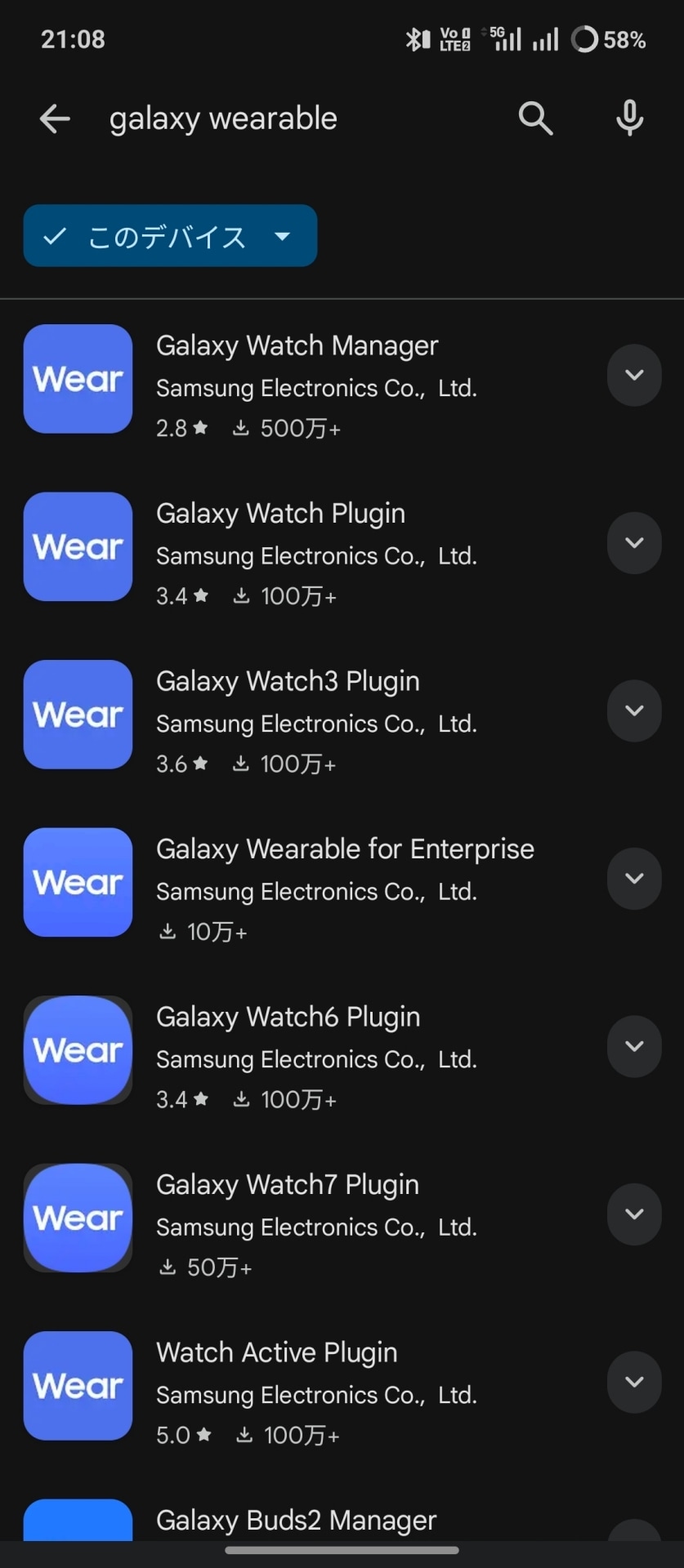 アプリは、スマートフォンとの接続、各種設定はGalaxy Wearableアプリ、健康管理機能の設定と情報の確認は、Samsung Healthアプリを使用します。アプリを縦断しなければならないのが難点なのに加え、Galaxy以外のAndroidスマートフォンと接続するためには、プラグインアプリのインストールが必要。加えて、Google Playストアを見ると、シリーズごとにプラグインアプリが配信されているため、必要なアプリが見つけづらくなっています。旧モデルのアプリが配信されているのは仕方ないとしても、スマートフォンと接続するための動線は、もう少し明瞭になって欲しいと感じています。