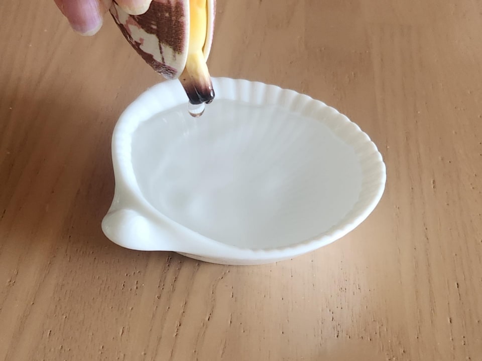 実際に測ってみると容量は約3ミリリットル。一般的なお弁当に入っている魚型のしょうゆ入れ「ランチャーム」が2.5ミリリットル程度なので、それよりやや多い。1回の給水で2~3回の噴射が可能で、室内外問わず軽快に遊べる。吸水方法は簡単で、コップや皿に張った水へ噴射口を差し込み、貝殻を押してから放せば自動的に水が吸い込まれる。