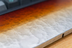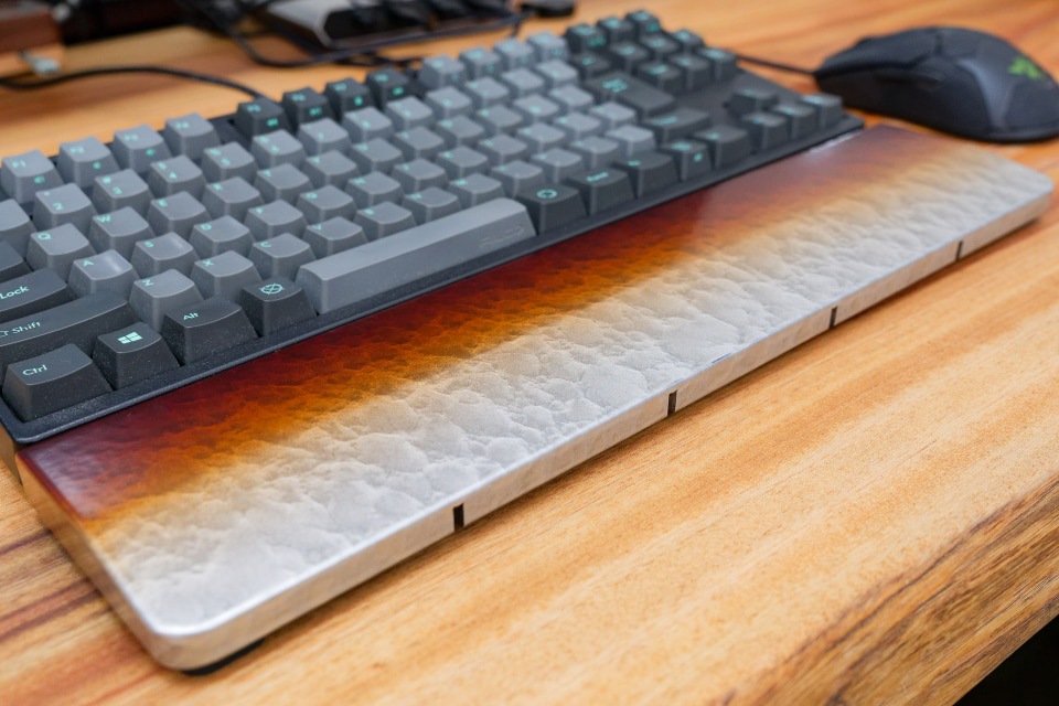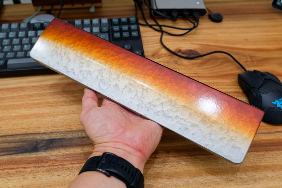 ということで購入したのが、国産キーボードのFILCOブランドで知られるダイヤテックの漆塗りリストレスト。ただ漆塗りってだけだと見た目に物足りないかも、と思い何やら、うにゅうにゅした模様の「蒸雲塗り」(じょううんぬり)で、デスクの色合いにマッチしそうな「茜雲」、かつ目を楽しませてくれそうな「グラデーション」を選んだ。サイズはテンキーレスキーボードにフィットするMに。