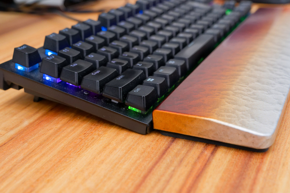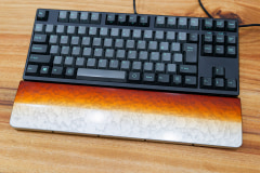 重ければ重いほどいい、という風潮のある昨今のメカニカルキーボードに比べると、この木製リストレストははるかに軽く、その分動いてしまいやすいのが気になるところ。ではあるのだけれど、圧倒的な高級感と満足感でタイプしていなくてもずっと腕を載せていたくなる、そんなリストレストだ。