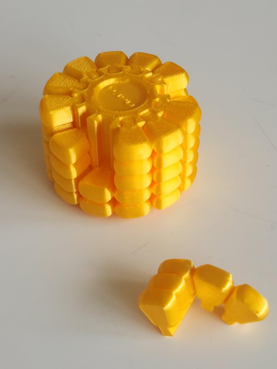 Temuを眺めていて思わず目に留まったのが、黄金に輝くトウモロコシのような物体だった。価格も数百円。説明を読むと、どうやらこれが“立体パズル”らしい。届いた現物は3Dプリンタ製の艶やかな黄色い円筒体で、中心の「芯」「①」に沿って粒ブロックを積み重ねていく仕組み。見た目はユーモラスだが、実際に挑戦すると予想以上に手強い。