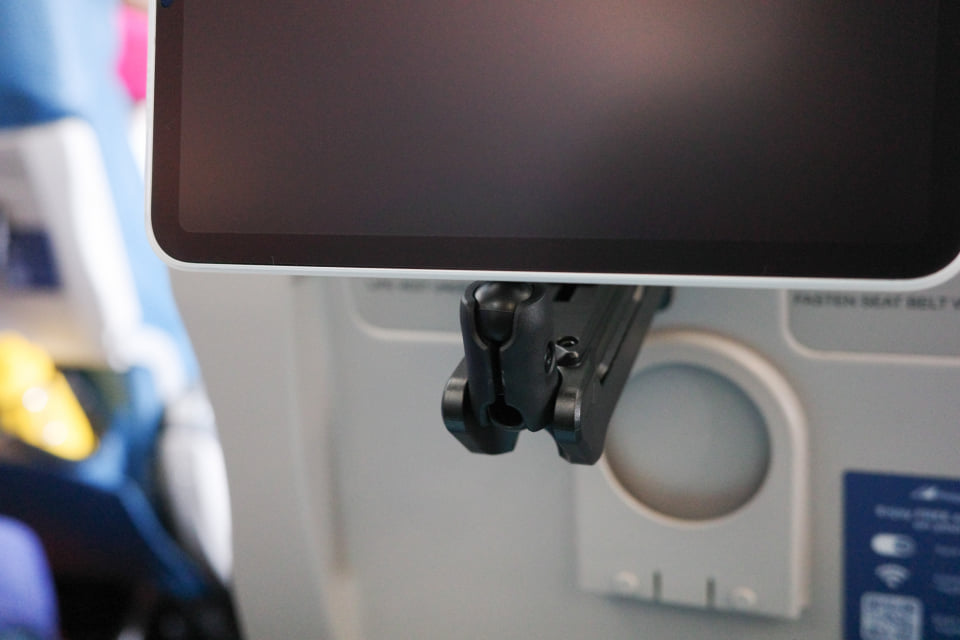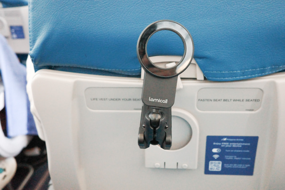 実際に往復の機内でスタンドを使ってみましたが、クランプで各所に取り付けるタイプのため、場所を選ぶことなく設置・固定できるのが魅力でした。