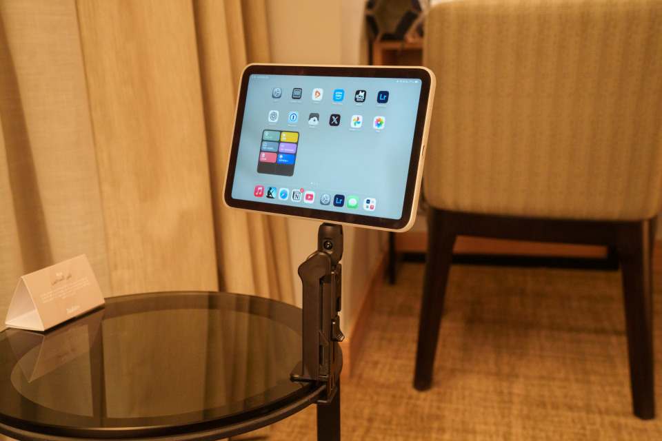 もちろんクランプ式のため、飛行機に限らずさまざまな場所に取り付けることも可能。滞在期間中はホテルのテーブルに設置し、iPhoneやiPadなどを見やすい位置で固定できるようにしていました。