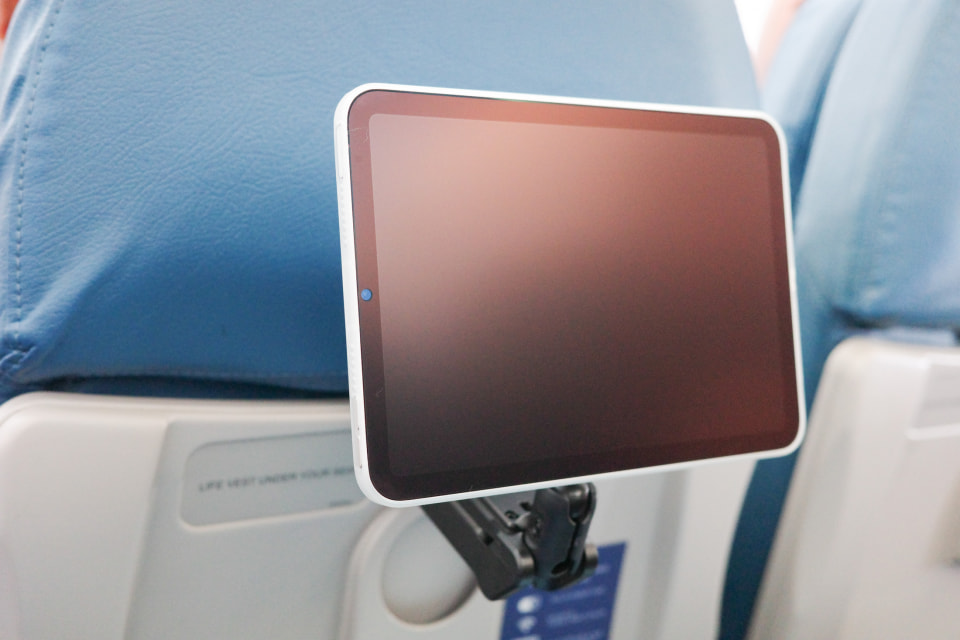 機内で寝る時間を加味してもおよそ9時間ほどは起床した状態で過ごすことになるため、少しでも有意義に過ごしたい……ということで、iPad miniを個人モニター代わりに使うことに。